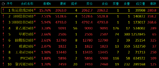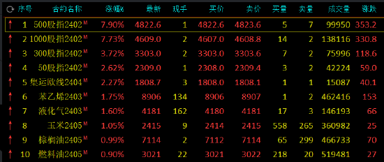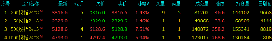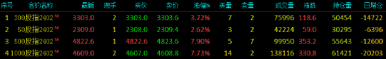 2024年2月6日,股指期货全线上涨,沪深300股指期货(IF)主力合约涨3.72%,上证50股指期货(IH)主力合约涨2.62%,中证500股指期货(IC)主力合约涨7.90%,中证1000股指期货(IM)主力合约涨7.73%。2月6日消息,指数