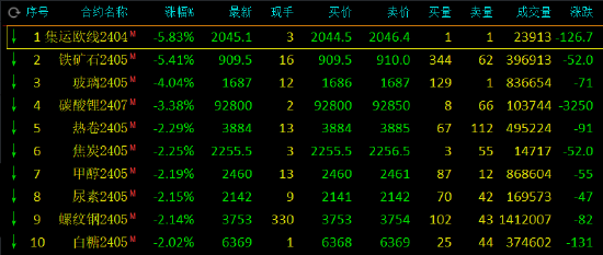 午盘收盘,国内期货主力合约涨跌互现。集运指数、铁矿石跌超5%,玻璃跌超4%,碳酸锂跌超3%,焦炭、热卷、尿素、甲醇、螺纹钢、白糖跌超2%;涨幅方面,液化石油气(LPG)、棕榈油、纸浆涨超1%。节后运价通常经历一个