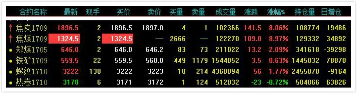 受雄安新区建设消息的影响,今日开盘黑色系商品便迎来暴涨。焦煤焦煤早盘跳空高开涨幅超8%,午后涨停,刷新四个月高位,焦炭涨幅亦超过8%。螺纹钢、铁矿午后跳水,但截止收盘仍保持1.77%和0.63%的涨幅。雄安新区建设