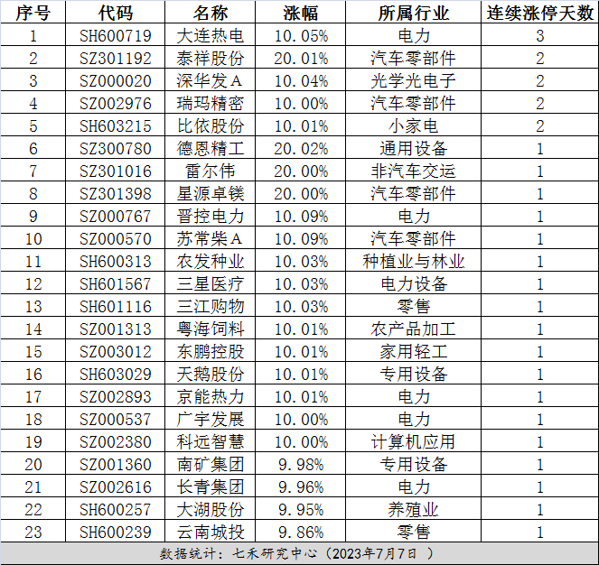 沪深两市连续涨停个股一览(2019.02.19-2023.07.07)注:该表统计标的为沪深两市所有个股(过滤当日上市新股、ST股、*ST股),统计时间为当天下午15:00收盘后。制表当日涨停股记为连续涨停一天,其余仅涨停一天的个