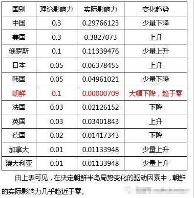 为简化计算,假设影响朝鲜半岛局势的变量包括11个,分别是中国、美国、俄罗斯、日本、韩国、朝鲜、法国、英国、德 国、加拿大和澳大利亚。每个变量设置一个相应的权重,所有11个权重的总和为1。 每个变量对应一个概