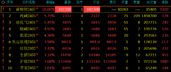 早盘收盘,国内期货主力合约多数上涨,碳酸锂封涨停板,涨幅10%,纯碱、液化石油气(LPG)涨超5%,烧碱涨近5%。跌幅方面,尿素跌超2%,低硫燃料油(LU)、玻璃跌超1%。碳酸锂:盘面强势涨停,基本面实质性变化不强据