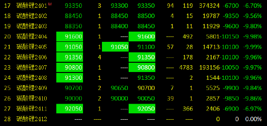 碳酸锂期货多个合约跌停,碳酸锂2404、2405、2406、2407、2408、2411合约均已触及跌停板。