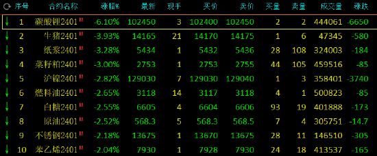 午盘收盘,国内期货主力合约互有涨跌。玻璃涨近8%,纯碱涨超6%,焦煤、尿素涨超2%。跌幅方面,碳酸锂跌6.74%,此前一度触及跌停;生猪跌近4%,菜粕、沪镍、纸浆、SC原油、白糖、燃料油、不锈钢(SS)跌超2%。沙河地