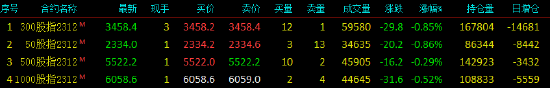 2023年12月4日,股指期货震荡下行,沪深300股指期货(IF)主力合约跌0.85%,上证50股指期货(IH)主力合约跌0.86%,中证500股指期货(IC)主力合约跌0.29%,中证1000股指期货(IM)主力合约跌0.52%。大盘今日震荡调