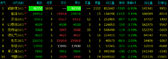 2023年12月4日,国内期市收盘,国内期货主力合约大面积飘绿,碳酸锂封跌停板,跌幅6.95%,焦煤、SC原油跌超5%,低硫燃料油(LU)、燃料油、液化石油气(LPG)、焦炭跌超3%。涨幅方面,纯碱涨超7%,玻璃涨超2%。