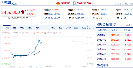 2023年11月27日,纯碱期货主力合约延续涨势,开盘后最高涨超8%。纯碱供应有所提升。除了西北地区两家碱厂仍减量生产外,其余纯碱装置生产稳定,行业无新增检修,生产水平明显提升。本周纯碱行业开工率88.83%,周环比