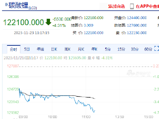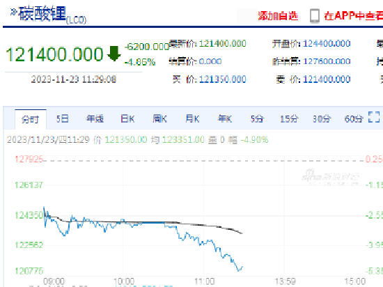 快讯:2023年11月23日,碳酸锂期货主力合约跌超4%,续创上市来新低,当前报价122100元/吨。中粮期货:基本面走弱,预期更弱。11月份是需求旺季转淡季的交接时间段,一是12月底的终端项目抢装潮在产业链表现为11月份