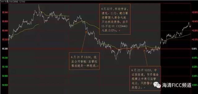 5月31日-6月19日,现券十年国债170010从3.65下行至3.50,十年国开债170210从4.36下行至4.1525,同时,十年国债期货T1709从94.30快速上涨至95.93,债券市场呈现“一片光明”。但是,紧接下来的三天6月20-22日(上周二