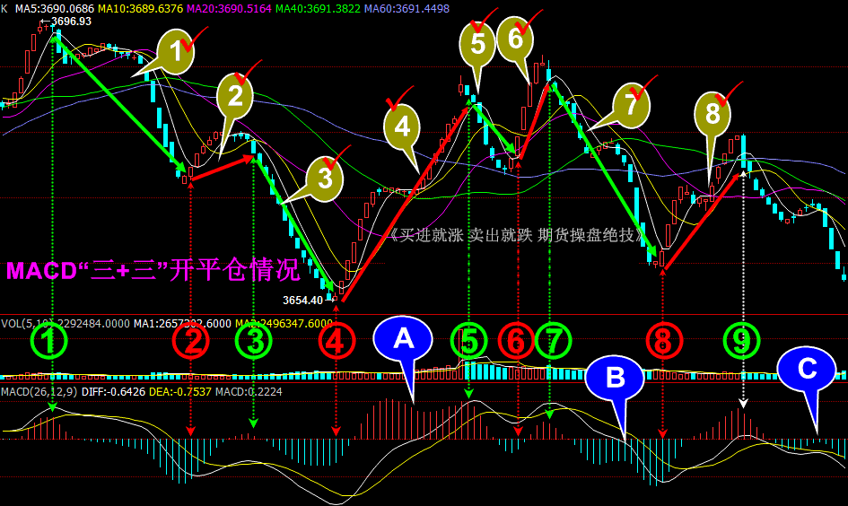 用“MACD三+三”真正实现“高抛低吸” 我们对MACD并不陌生,也知道其最最精典的口诀是“金叉买进、死叉卖出”,按这个口诀操作,在单边行情里确实是赢利了,但在震荡行情里,绝大多数是亏损的,且进出场的点位也