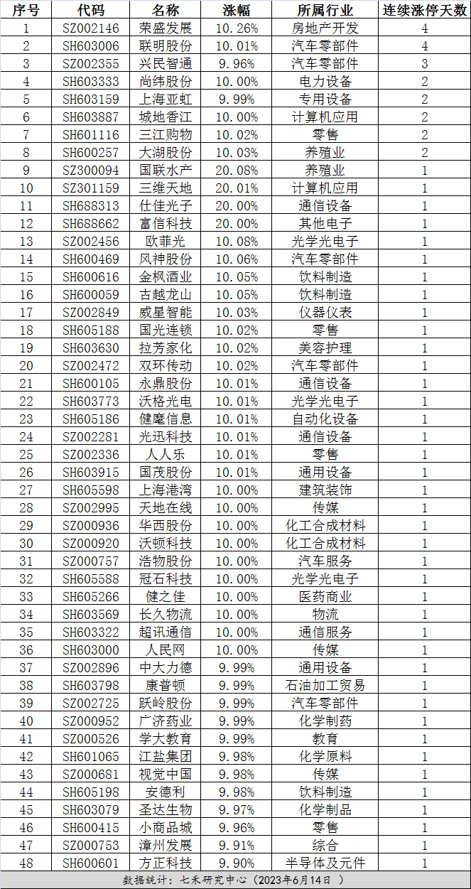 连续涨停0614:荣盛发展收获四连板