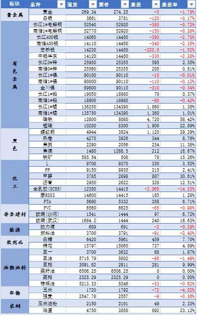 注:1月1日起,本数据不再公开发布,如有需要可订阅资管持仓及现货基差打包数据,详情点击>>>2017年12月18日商品现货价格与基差跟踪表注1:基差=现货-期货主力合约收盘价注2:基差率=基差/期货主力合约收盘价以上数