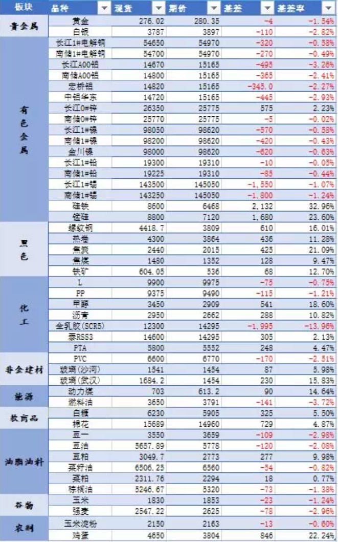 2018年1月4日商品现货价格与基差跟踪表注1:基差=现货-期货主力合约收盘价注2:基差率=基差/期货主力合约收盘价以上数据来源于宏源期货研究中心(制表:张小凯)