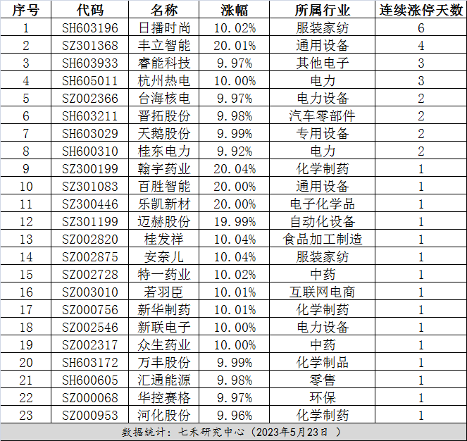 沪深两市连续涨停个股一览(2019.02.19-2023.05.23)注:该表统计标的为沪深两市所有个股(过滤当日上市新股、ST股、*ST股),统计时间为当天下午15:00收盘后。制表当日涨停股记为连续涨停一天,其余仅涨停一天的个