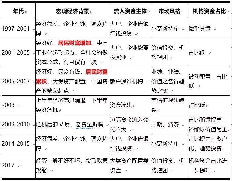 我把过去的 20 年的 A 股划分为 8 个阶段,在这八个阶段我们能看到不同部门资金流入流出以及相应的规律。我们在这个过程中看到历史如何的重演,如何一次次的羞辱没有经历过的人和如何调戏认为这次不一样的人,“花相