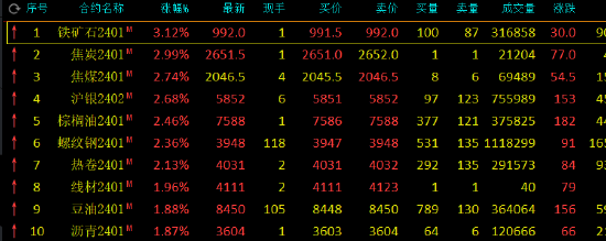 早盘开盘,国内期货主力合约多数上涨,铁矿、焦炭涨超3%,焦煤涨近3%,螺纹、棕榈油、沪银、热卷涨超2%。跌幅方面,集运指数(欧线)跌超1%。