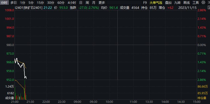 国家发改委消息,针对近期铁矿石价格出现异动上涨的情况,国家发展改革委价格司派员赴大连商品交易所,共同研究加强铁矿石市场监管工作。 11月15日晚间,铁矿石主力合约短线跳水,截至发稿,跌幅达2.76%,现