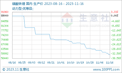 生意社11月16日讯 根据生意社商品行情分析系统显示:截止11月16日动力型优等品磷酸铁锂均价59400元/吨,近期磷酸铁锂价格持续下滑走势,相比上周同期价格下跌了2.94%,相比本周初价格下跌了1.66%。 磷
