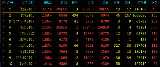 午盘收盘,国内期货主力合约涨多跌少,焦煤涨超3%,PTA、焦炭、对二甲苯(PX)涨超2%,沪铅、纸浆、短纤涨近2%。跌幅方面,SC原油跌超2%,燃油跌近2%。河北、山西等地期现贸易企业纷纷入场采购蒙煤,最新成交价突破