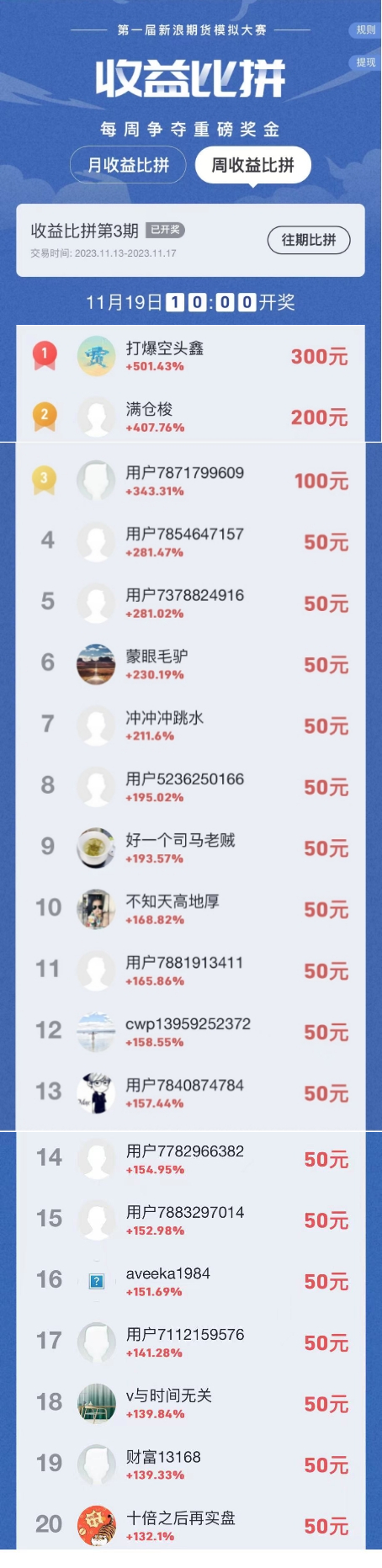 新浪期货模拟大赛第3期周赛比拼榜单公布(11.13-11.17):周热门交易品种纯碱 第一收益单周高达500%!