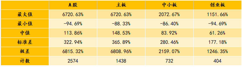 表:十年间A股及各板块涨跌全景图数据来源:wind,如是金融研究院本文以全部A股及其内含的主板、中小板和创业板,共4个板块的成分股(剔除2015年1月1日之后上市的个股)为样本,对样本股票2009年1月1日至2019年4月22