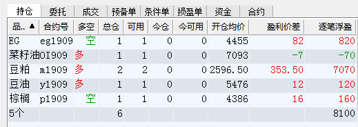 一、开仓总结 1、豆粕:2019年5月7日,豆粕指数合约下午收盘前,在日线上出现了一波短期三角形整理后的向上突破,所以5月7日下午收盘前,将1手空单平仓后,分别在14:51和14:54各开多1手豆粕1909合约,开仓价分别
