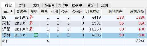 一、开仓总结 1、乙二醇:2019年6月18日,乙二醇指数合约下午收盘前,在日线上出现了一波短期横盘整理后的向上突破,所以6月18日下午收盘前,在14:58将1手乙二醇1909空单平仓后,开多1手乙二醇1909合约,开仓价为