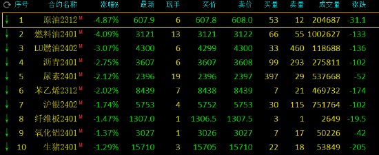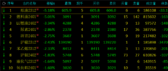 早盘收盘,国内期货主力合约跌多涨少。纯碱、菜粕、纸浆、硅铁涨超1%;跌幅方面,SC原油、燃料油跌超5%,低硫燃料油(LU)跌超3%,尿素、沥青、沪镍、苯乙烯(EB)跌超2%。市场弱势格局进一步确立,原油持续走低隔夜