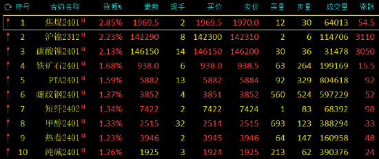 早盘开盘,国内期货主力合约多数上涨,焦煤、沪镍涨超2%,PTA、铁矿涨近2%,短纤、螺纹、热卷、甲醇、对二甲苯(PX)、聚氯乙烯(PVC)涨超1%。跌幅方面,SC原油跌超3%,烧碱、沥青跌近2%,玻璃跌超1%。
