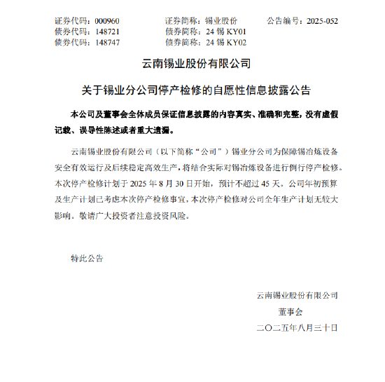 锡业股份:锡业分公司将进行例行停产检修 预计不超过45天