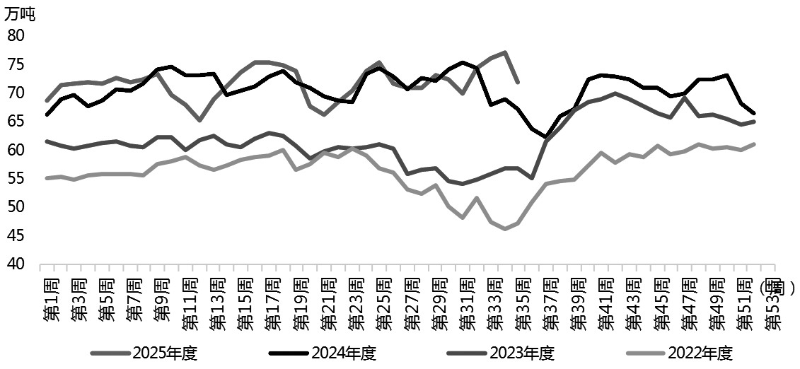 近期,纯碱期货开启新一轮下跌行情,8月15日至今,2601合约跌幅超过8%。图为纯碱期货2601合约走势纯碱的传统检修季为夏季。受检修影响,近期国内纯碱供应显著下滑,供应压力有所缓和。不过,受纯碱周度产量仍然处于