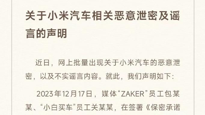 @小米公司发言人 12月19日晚发布关于小米汽车相关恶意泄密及谣言的声明。