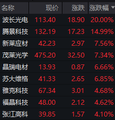今日,光刻机(胶)板块表现活跃,板块内5只个股涨停。截至发稿,波长光电20CM涨停,腾景科技涨超15%,华软科技、西陇科学、凯美特气、永新光学涨停,苏大维格涨超8%,晶瑞电材、新莱应材涨超7%,海立股份涨超6%。消息