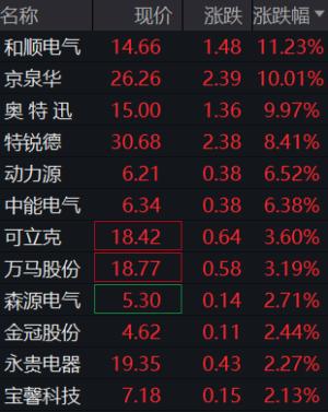 充电桩板块今日表现强势,多只个股涨停。截至9点45分,和顺电气涨超11%,富特科技涨超10%,通达股份、京泉华、奥特迅涨停,派诺科技、中能电气、动力源涨超8%。消息面上,国家发改委等部门10月15日印发《电动汽车充