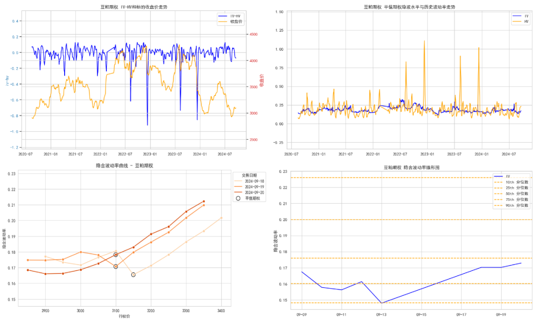 标的价格&平值期权价格指数:农产品&软商品期货价格波动不一,棕榈油较上周有较大涨幅,涨幅为:5.33%, 橡胶涨幅为:4.99%。豆粕跌幅为:0.33%, 玉米跌幅为:1.64%。平值期权价格指数方面,棕榈油较上周有较大涨幅,涨幅为:138.80%, 豆油较上周有较大涨幅,涨幅为:96.95%豆粕跌幅为:3.70%, 菜粕较上周有较大跌幅,跌幅为:18.98%;