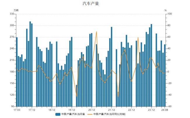 中国汽车工业协会数据显示,8月份,我国汽车产销量分别达249.2万辆和245.3万辆,环比分别增长9%和8.5%,同比分别下降3.2%和5%。今年1至8月,我国汽车产销量分别达1867.4万辆和1876.6万辆,同比分别增长2.5%和3%,汽车产销量同比保持稳步增长态势。