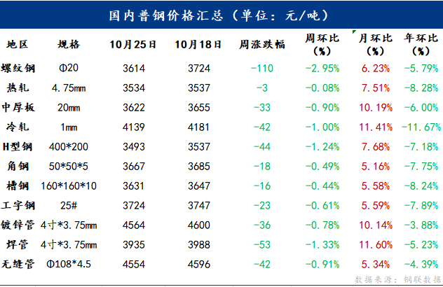 25日国内主要品种呈现统一下跌的走势。主要品种中,螺纹钢均价报收3614元/吨,周环比下跌110元/吨;热轧板卷均价报收3534元/吨,周环比下跌3元/吨;中厚板均价报收3622元/吨,周环比下跌33元/吨;冷轧板卷均价报收4139元/吨,周环比下跌42元/吨。