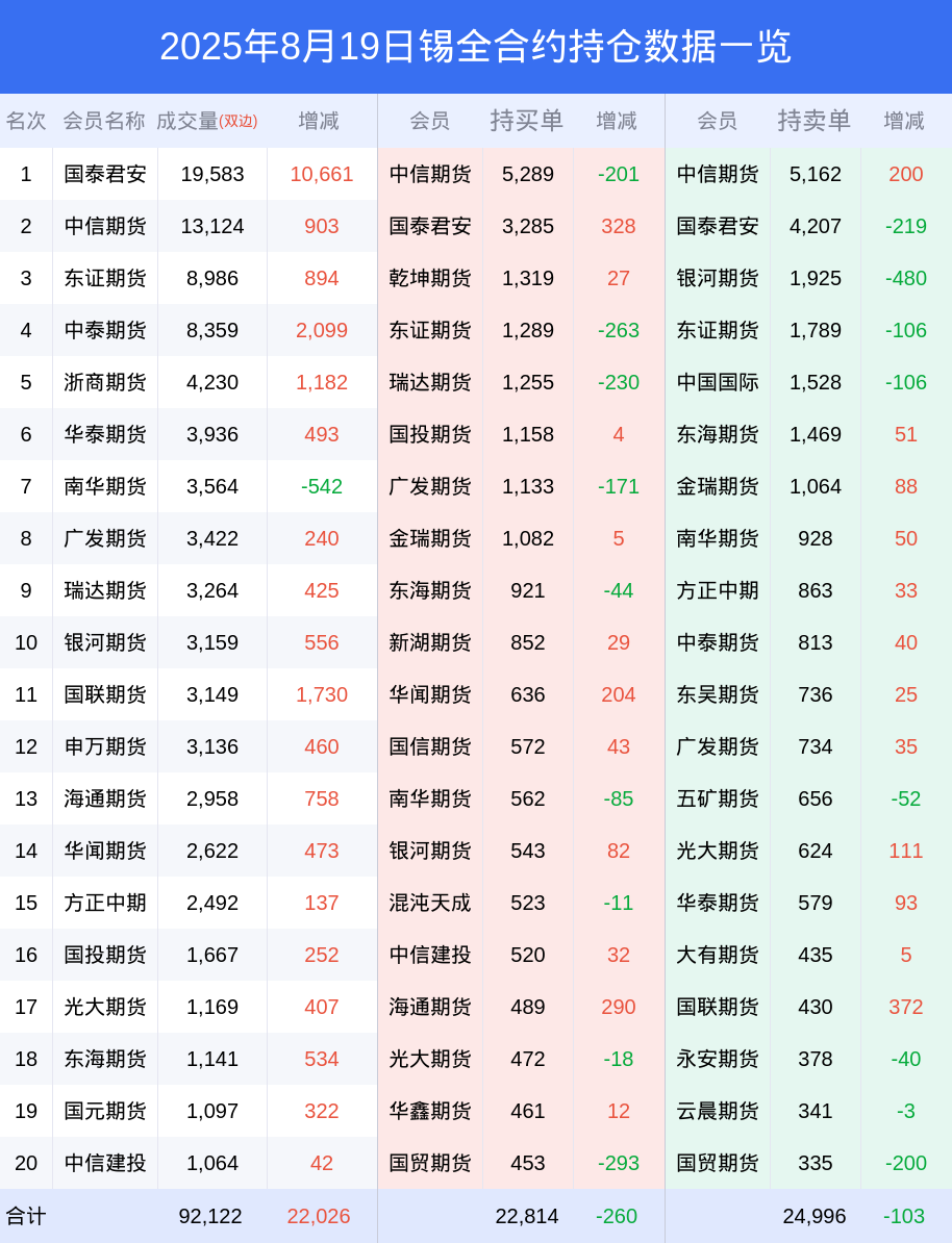 2025年8月19日,锡主力合约涨0.46%,全市场涨幅第5名。