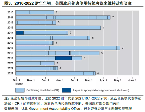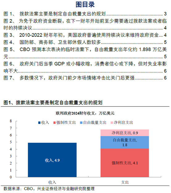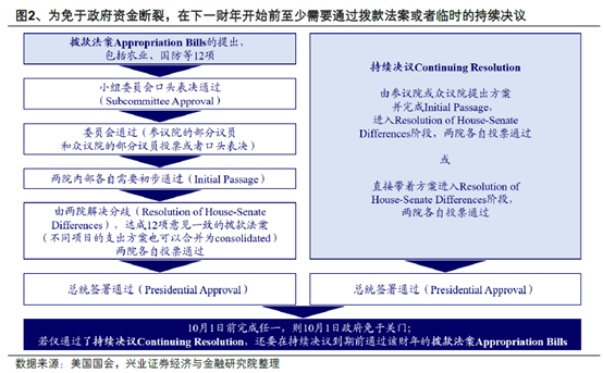 美国政府为什么关门?政府关门在历史上并不罕见。美国联邦政府每个财年需要制定拨款法案(Appropriation Bills),经由拨款程序获得资金。拨款法案分为农业、国防等12个项目,参议院、众议院需对每一项资金法案达成一致,最终由总统签署通过才能生效(详参《美国财政入门》)。若两党谈不拢、法案在新财年开始的10月1日之前未能通过,依照法律,除了发放社保等必要职能外,联邦政府机构必须关门(shutdown)。拨款法案通过前,国会可通过一项短期的支出方案来提供临时资金来避免政府关门,这种临时拨款法案称为“持续决议(Continuing Resolution, CR)”。目前,2026财年的完整版拨款法案尚未敲定,在新财年开始之际,国会正在讨论使用持续决议短暂地维持政府资金至11月21日,但9月30日参议院投票中,这项持续决议仅获得55票,不满足60票的通过条件,未能获参议院通过,造成政府关门。
