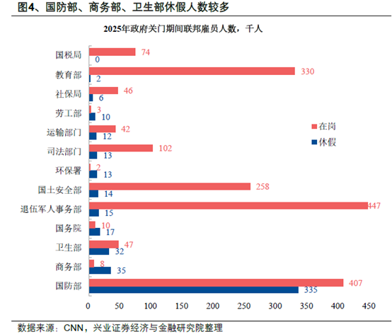 哪些机构和业务受到影响?非必要职能的雇员无薪休假,且部分政府功能受到制约,包括非农就业等经济数据公布暂停(劳工统计局已确认暂停所有业务)、小企业贷款受限、社保卡开户停止等。不受影响的业务包括:移民执法活动将继续进行,社会保障金、医疗保险(Medicare)和医疗补助(Medicaid)将正常发放但可能有延迟、传染病防控工作继续但研究类工作暂停。据CBO估计,约75万名联邦雇员可能会在关门期间休假,受影响的薪水总额约4亿美元/日。