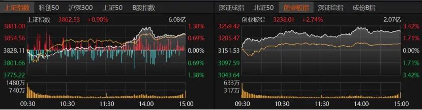截至周一收盘,沪指收涨0.9%报3862.53点,创业板指收涨2.74%报3238.01点,深证成指涨逾2%。科创50、沪深300、上证50涨幅超过1%,北证50微涨。