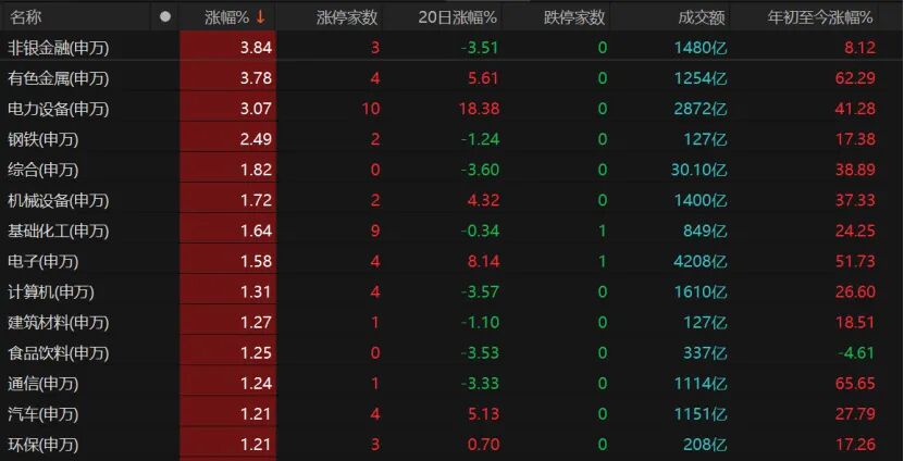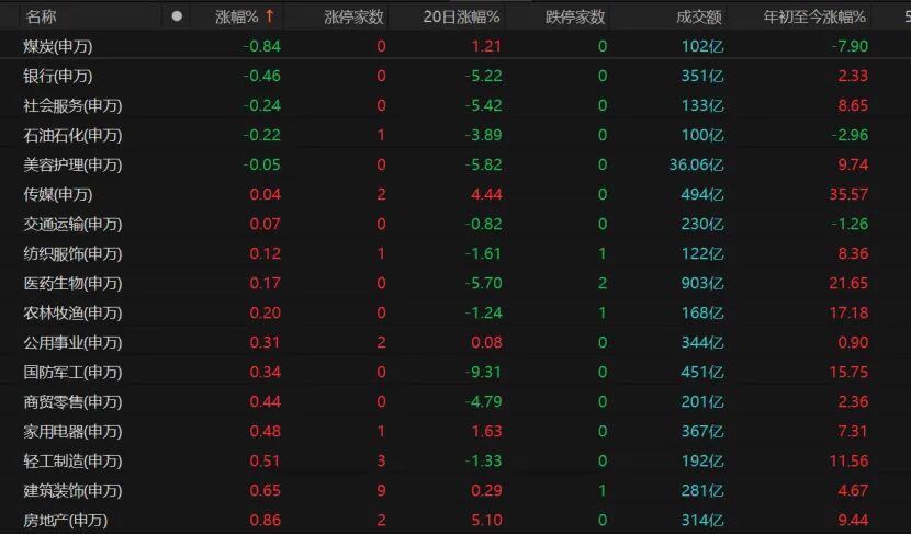 相比之下,煤炭、银行、社会服务、石油石化等传统股表现一般,交通运输、纺织服饰、农林牧渔微涨。