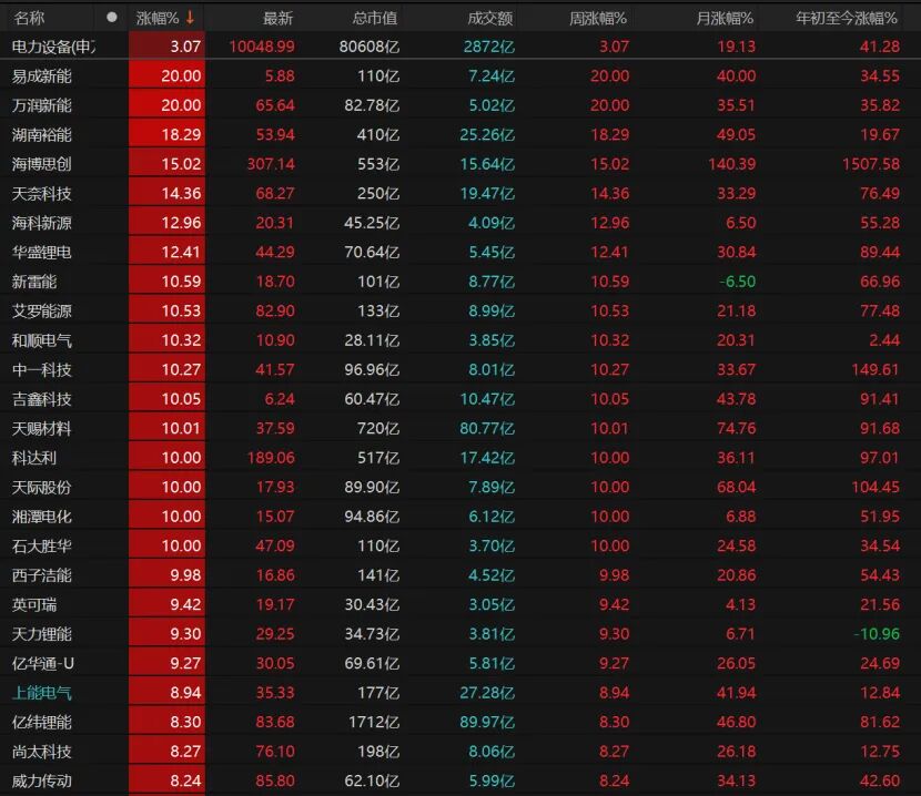 近期电力设备备受资金喜爱,周一该板块涨幅超过3%,易成新能、万润新能20cm涨停,吉鑫科技、天赐材料、科达利、天际股份等个股也涨停。