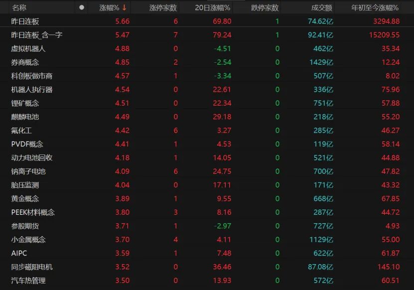 虚拟机器人、券商概念、机器人执行器、锂矿概念、麒麟电池、动力电池回收、黄金概念等表现亮眼。