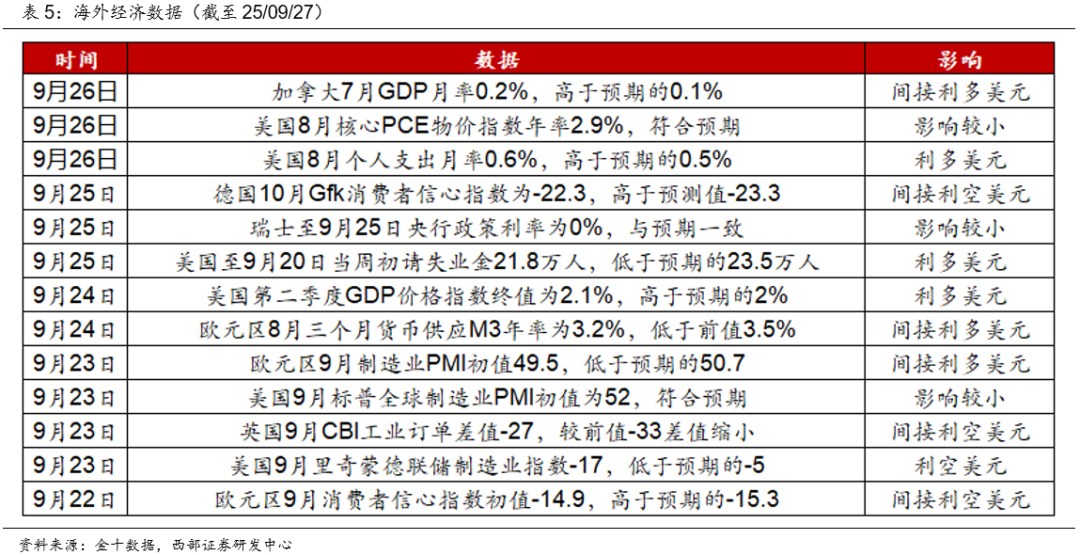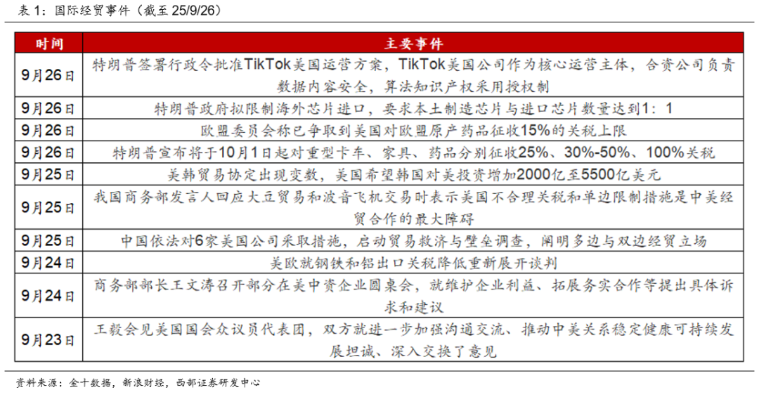 中美对话增加、合作推进,两国经贸关系逆势向好。特朗普再次宣布针对特定商品征收关税,政策思路依然围绕增加关税收入、增加谈判筹码以获得投资、提升芯片/药品等关键领域的自主可控能力三方面,贸易政策不确定性增加但不至于失控。海外对美投资协定落实落细,甚至加码,有助于提振美国经济并带动资本品需求,脱离资本回报逻辑的投资对于非美国家而言则是负担,可能导致美元偏强。从TikTok方案来看,中方利益得到较大程度保障,可见中美博弈中中方不处于劣势,随着中美贸易关系修复,我国总体有望受益。