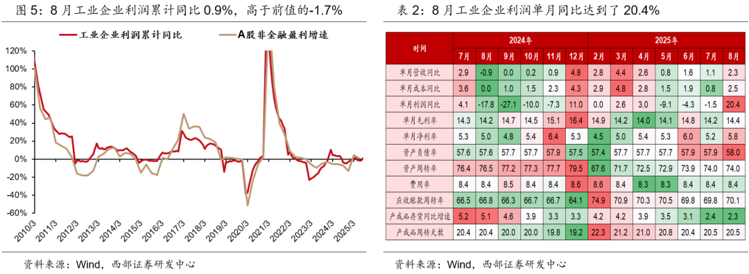 基数效应导致单月利润增速大增,利润率修复幅度仍不明显。8月工业企业利润累计同比0.9%,单月同比20.4%,主要由于去年8月低基数,9月基数同样较低,意味着三季度企业利润可能相对较强。毛利率虽然较7月小幅改善,但较24.9-25.2区间仍有差距,可见工业企业整体毛利率受需求影响更大,而反内卷的效果尚不明显,可能暂时更多表现出结构性影响。产成品存货增速延续降速,说明库存持续去化,叠加反内卷推进,价格修复的确定性较强,价格拐点可能也不远。