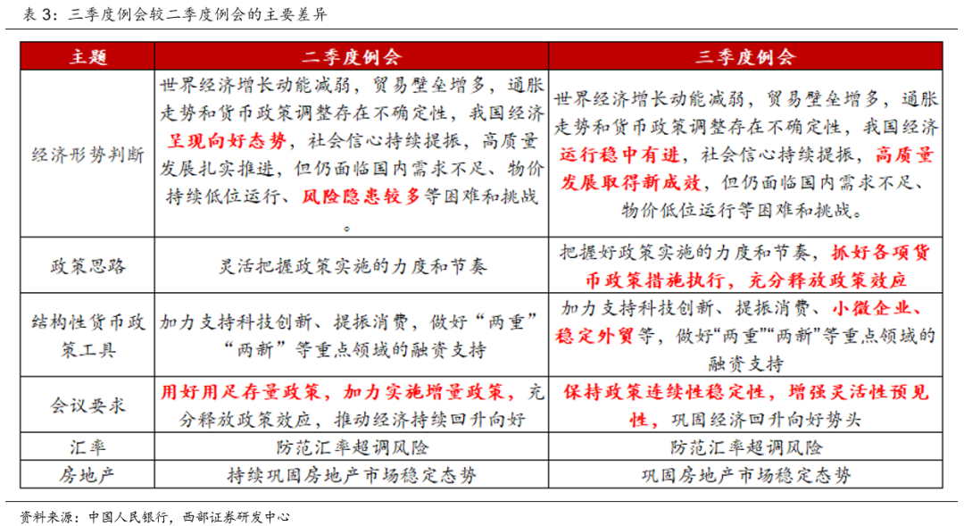 四季度政策或相对审慎,需为未来政策预留空间。三季度例会相较二季度变化不大,去除“风险隐患较多”表述,体现央行对现状相对乐观,不提“加力实施增量政策”,四季度降息预期不强,结构性货币政策补充“小微企业和稳定外贸”,四季度相关工具有望落地。会议降调“保持政策连续性稳定性”,说明适度宽松基调不变,在经济复苏基础尚不稳固的当下,政策转向概率很小,“增强灵活性预见性”中,“灵活性”在调整流动性投放工具招标方式中已有所体现,“预见性”可能指对海外政策和流动性风险的预判,也可能是对未来几年政策空间的考量,总体应理解为审慎态度。上周MLF超额投放,9月重启央行买债基本落空,但买卖国债是存量政策,10月仍有可能配合增量财政政策恢复。