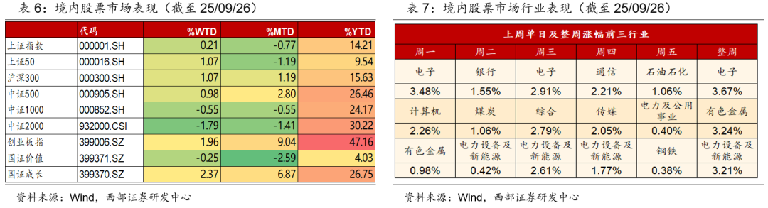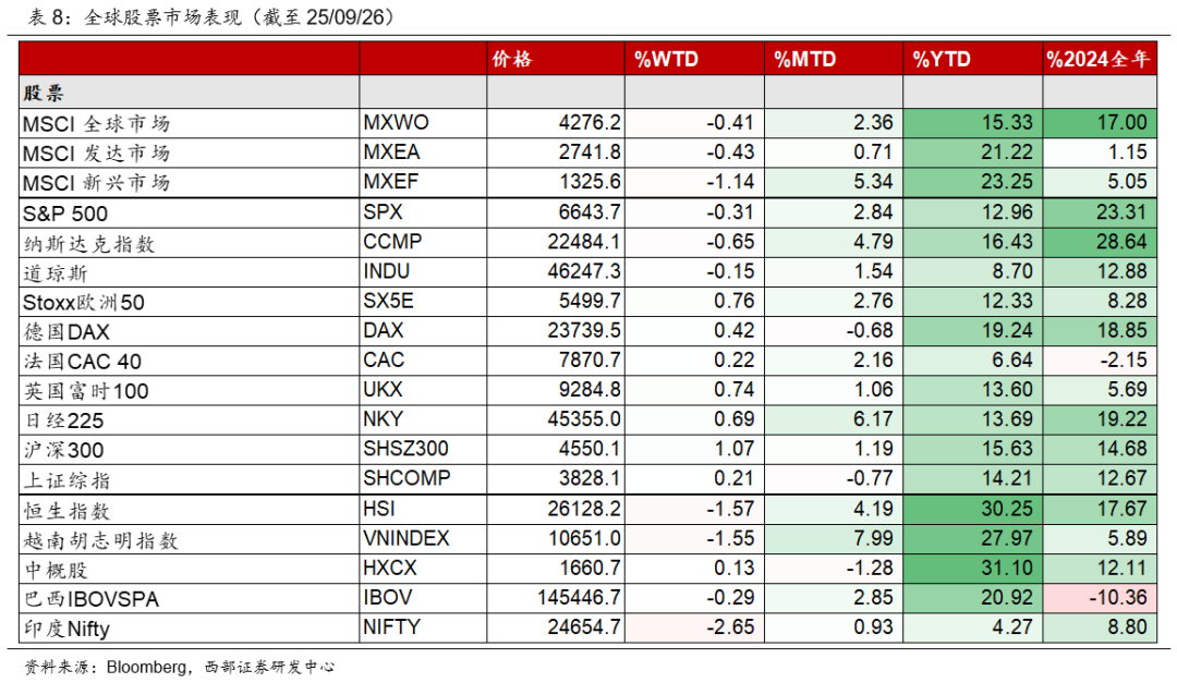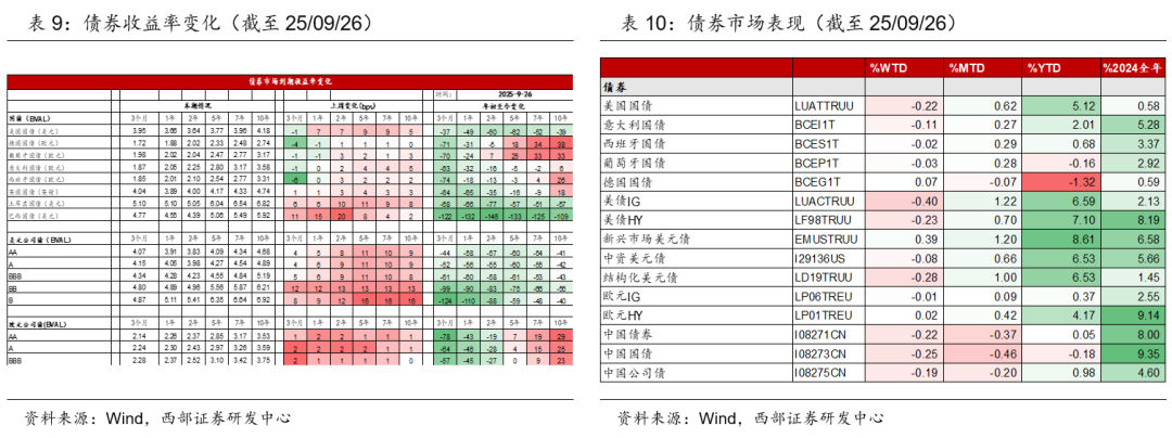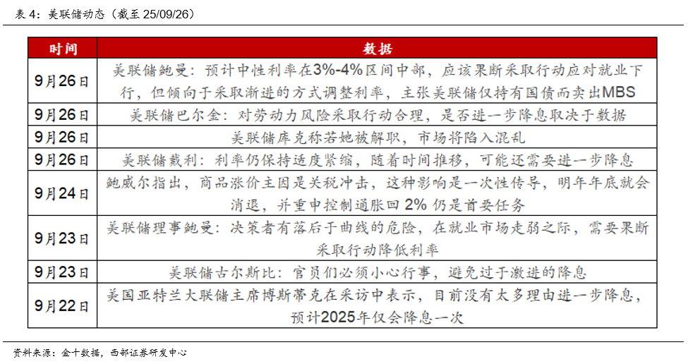 库克去留影响美联储独立性,政府停摆或导致数据公布延后。继续关注特朗普解雇库克一案进展,目前美司法部与经济学家分别对联邦最高法院进行施压,该决定将成为影响美联储独立性的重大事件。上周美联储委员发言基本延续此前观点,鸽派和鹰派分化明显。不过鲍曼作为鲍威尔提名的理事,虽然仍然偏鸽,但与白宫的观点存在分歧,意味着特朗普完全掌控美联储的难度仍然不小。