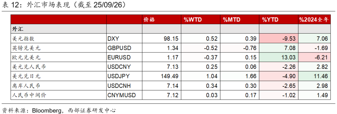 美国经济数据偏强,美元升值;受美元走强和中间价影响,人民币小幅贬值。上周美元指数收至98.2,较前一周上涨0.52%,欧元贬值0.37%,英镑贬值0.52%,日元贬值1.04%,在岸人民币贬值0.25%至7.13,离岸人民币贬值0.34%至7.14,人民币中间价贬值0.03%至7.12。