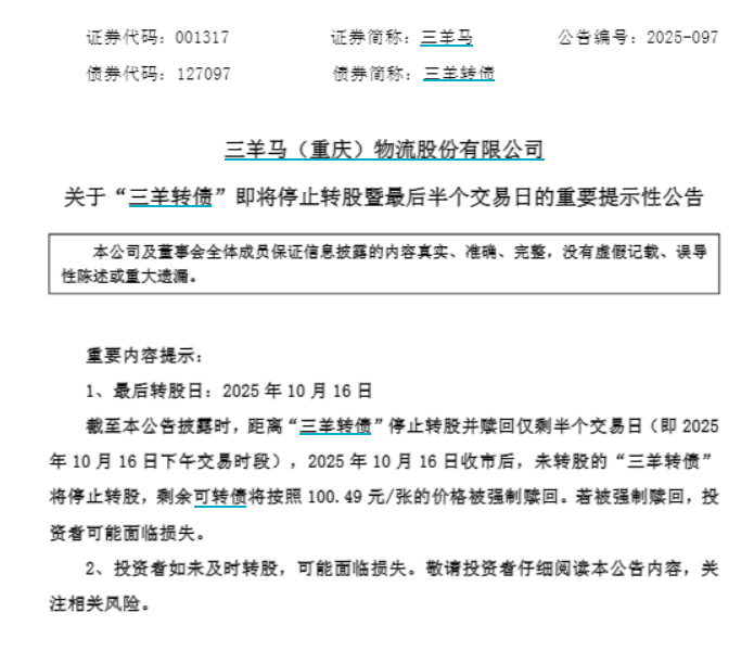 三羊马公告,距离“三羊转债”停止转股并赎回仅剩半个交易日(即2025年10月16日下午交易时段),2025年10月16日收市后,未转股的“三羊转债”将停止转股,剩余可转债将按照100.49元/张的价格被强制赎回。若被强制赎回,投资者可能面临损失。